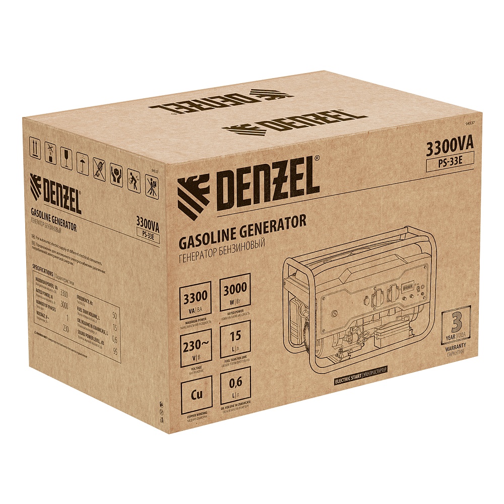 <p>Генератор бензиновый Denzel PS-33E 94537 с электростартером, мощностью 3,3 кВт, напряжением 230 В, с топливным баком объемом 15 л, предназначен для автономного обеспечения бытовой техники и инструментов электрической энергией. Отлично подойдет для использования в загородном доме или для выездных мероприятий в качестве резервного источника питания. Мощный и экономичный двигатель позволяет подключать электроприборы суммарной мощностью до 3,3 кВт, потребляя всего 1,15 литров топлива АИ-92 за 1 час работы.</p><h2>Преимущества</h2><ul><li>Два типа запуска — генератор можно привести в действие как вручную, так и при помощи электростартера ключом зажигания.</li><li>Комплексная защита — система Multi protect не допускает запуск при пониженном уровне масла, предохраняет генератор от перегрузки и короткого замыкания.</li><li>Надежность — альтернатор генератора выполнен с медной обмоткой, распределительный вал изготовлен из прочной стали.</li><li>Автоматическая система стабилизации напряжения — блок AVR позволяет подключать к генератору даже чувствительные к перепадам напряжения электронные приборы и бытовую технику.</li><li>Усиленная рама — генератор можно устанавливать на строительных площадках и часто транспортировать без риска повреждения, также трубы увеличенного диаметра удобны для захвата при погрузке и разгрузке установки.</li><li>Удобное использование — все элементы управления вынесены на переднюю панель.</li><li>Полная готовность к работе — в комплект входят аккумулятор, свечной ключ, 2 вилки 230В/16А и 2 ключа зажигания.</li><li>Подтверждено качество — гарантия от производителя 3 года.</li></ul>