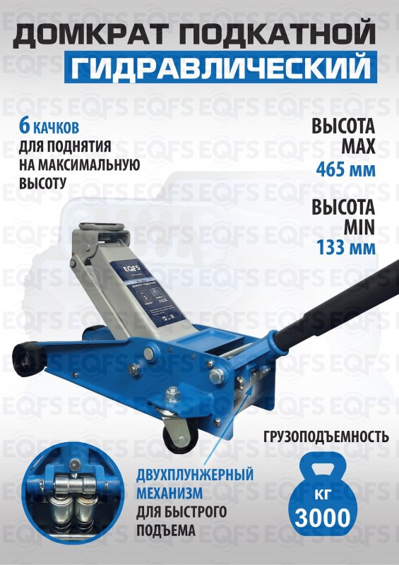 Гарантия 1 год. Профессиональный. Для интенсивной эксплуатации. 6 качков для поднятия на максимальную высоту. Двухштоковый механизм быстрого подъема. Подкатной. Имеет повышенную износостойкость. Поворотная ручка, лоток для хранения и резиновая накладка на чашку домкрата в комплекте. Грузоподъемность 3 тонны с усиленными ребрами жесткости. Высота подъема 133-465 мм. Вес: 31,5 кг.