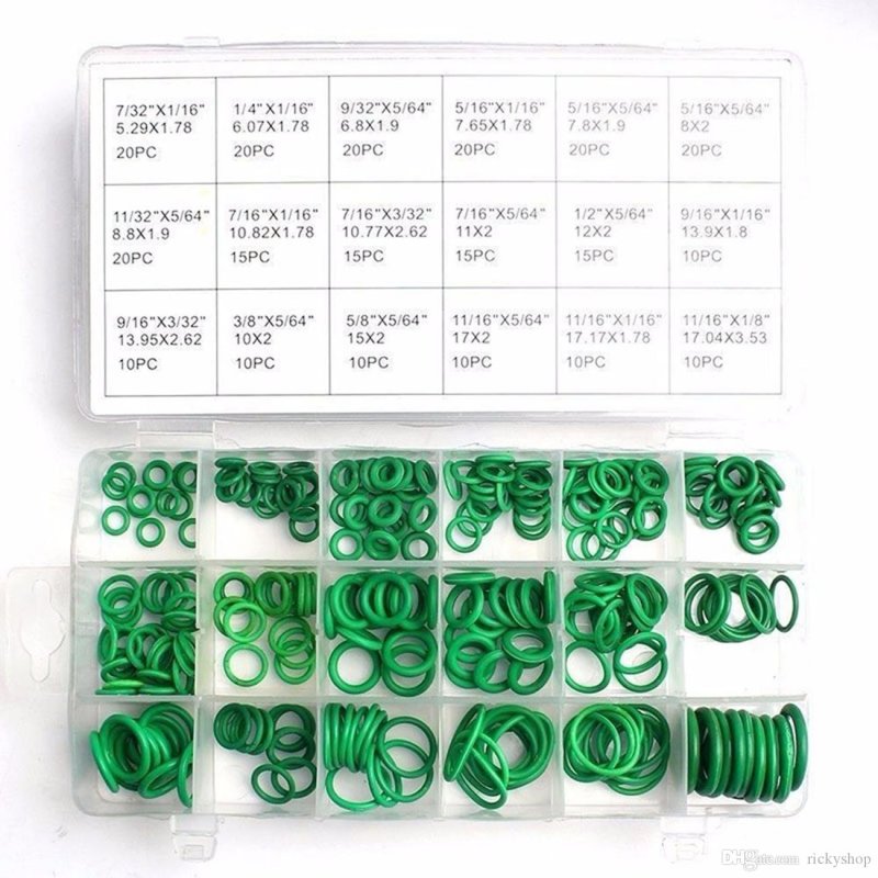 Набор уплотнительных колец 225 шт. используются в качестве расходных материалов при ремонте и обслуживанию систем кондиционирования автомобилей, использующих хладагенты марок R-12 и R-134A. Комплектация 20pcs 3 x 1mm 20pcs 4 x 1mm 20pcs 4.5 x 2mm 20pcs 5 x 2mm 20pcs 6 x 2mm 20pcs 6 x 2.5mm 20pcs 6 x 3mm 20pcs 7 x 2mm 20pcs 8 x 2mm 5pcs 9 x 2mm 5pcs 10 x 2mm 5pcs 12 x 3mm 5pcs 13 x 3mm 5pcs 14 x 2.5mm 5pcs 17 x 2.5mm 5pcs 18 x 4mm 5pcs 20 x 2mm 5pcs 22 x 2mm Бокс.