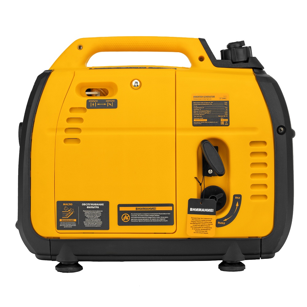 <p>Инверторный генератор Denzel GT-1200iS 94701 мощностью 1,2 кВт, в закрытом корпусе, с ручным стартом, — самый компактный, легкий и экономичный в своей линейке, с ним легко справится даже неопытный пользователь. Идеально подходит для выездов на природу и рыбалку, также будет незаменим на дачном участке и в торговой палатке. Четырехтактный двигатель мощностью 1,8 л.с. и объемом 53,5 куб. см работает стабильно и имеет небольшой уровень шума 52 дБ.</p><h2>Преимущества</h2><ul><li>Высокое качество тока — генератор оптимален для подключения чувствительной электроники: компьютерной техники, газовых котлов с электронным управлением, охранных и пожарных систем.</li><li>Защита от поломки — при низком уровне масла, перегрузке или коротком замыкании двигатель автоматически отключается.</li><li>Долговечность — медная обмотка альтернатора увеличивает срок службы аппарата.</li><li>Надежность — корпус из прочного противоударного пластика защищает внутренние детали от повреждений.</li><li>Визуальный контроль — индикаторы на передней панели информируют о работе генератора, недостаточном уровне масла и о перегрузке.</li><li>Экономичность — электронная система зажигания и электронный регулятор оборотов двигателя позволяют сберечь до 40% топлива, в зависимости от степени загрузки.</li><li>Долгая работа без дозаправки — генератор способен работать почти 3,5 часа на 2,4 л топлива.</li><li>Режим ECO — при работе с небольшой нагрузкой автоматически снижаются обороты двигателя, что позволяет еще больше снизить расход топлива.</li><li>Мобильность — благодаря небольшому весу 14,5 кг и комфортной ручке генератор удобно перемещать.</li><li>Гарантия 3 года — высокое качество генератора подтверждено производителем.</li></ul>