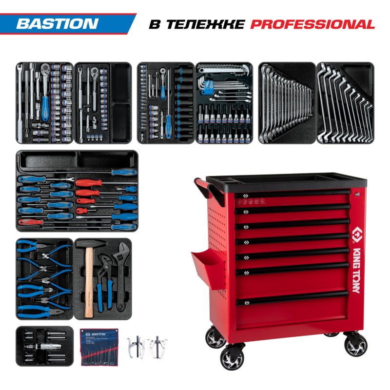 Набор инструментов 204 предмета, "BASTION", в красной тележке KING TONY 9G38-100MRR купить в Перми цена ✅ - Все для СТО