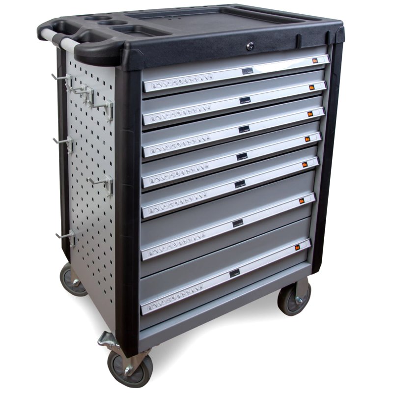 Передвижная инструментальная тележка, 5 стандартных ящиков, 2 больших ящика для хранения инструмента и расходных материалов обеспечивает удобство и мобильность при выполнении различного вида работ.
