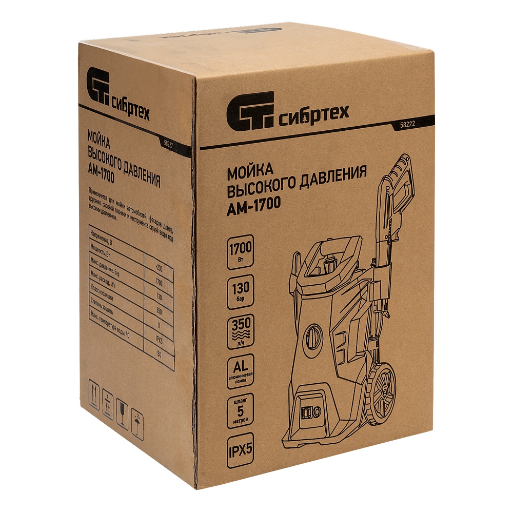 <p>Колесная моечная машина высокого давления Сибртех АМ-1700 58222 мощностью 1700 Вт поддерживает давление 130 бар и расходует 350 л воды в час. Предназначена для бытового применения, успешно справляется как с естественными загрязнениями, так и с въевшимися пятнами или масляными разводами. Может использоваться для мытья автомобиля, очищения садовых дорожек, фасада дома, заборов, инвентаря и других предметов. Машина способна работать с режиме самовсасывания, поэтому отсутствие водопровода не помеха: источником воды может быть любой водоем или резервуар.</p><h2>Преимущества</h2><ul><li>Термозащита — в случае перегрева двигатель останавливается, что предотвращает его поломку.</li><li>Безопасность — перепускной клапан не допускает превышения максимального рабочего давления.</li><li>Защита от непредвиденного пуска — главный выключатель препятствует случайному включению, рычаг пистолета блокируется в выключенном положении.</li><li>Высокий ресурс — алюминиевая крыльчатка помпы устойчива к коррозии.</li><li>Быстрая подготовка к работе — пистолет подключается одним движением, шланг подачи воды присоединяется при помощи быстросъемного адаптера.</li><li>Эффективная фильтрация — вода на входе очищается от частиц грязи и мелкого песка, поэтому обрабатываемые поверхности и крыльчатка помпы не царапаются и не разрушаются. </li><li>Использование моющих средств — к пистолету можно подключить пенообразователь (не входит в комплект поставки).</li><li>Эргономичность — производитель предусмотрел кронштейн для сетевого шнура и держатель для пистолета.</li><li>Компактность — моечная машина не занимает много места, ее можно хранить даже в квартире.</li><li>Удобное перемещение — у машины имеются большие колеса и рукоятка.</li></ul>