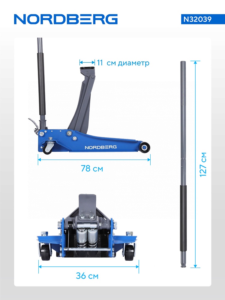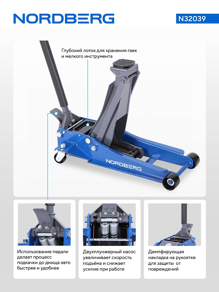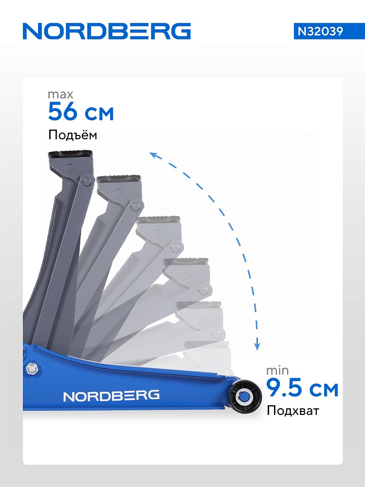 NORDBERG N32039 —  предназначен для технического обслуживания, ремонта и замены колёс легковых и лёгких коммерческих автомобилей на ровной твёрдой поверхности. Обеспечивает безопасный и устойчивый подъём, что позволяет надёжно установить опорные стойки.