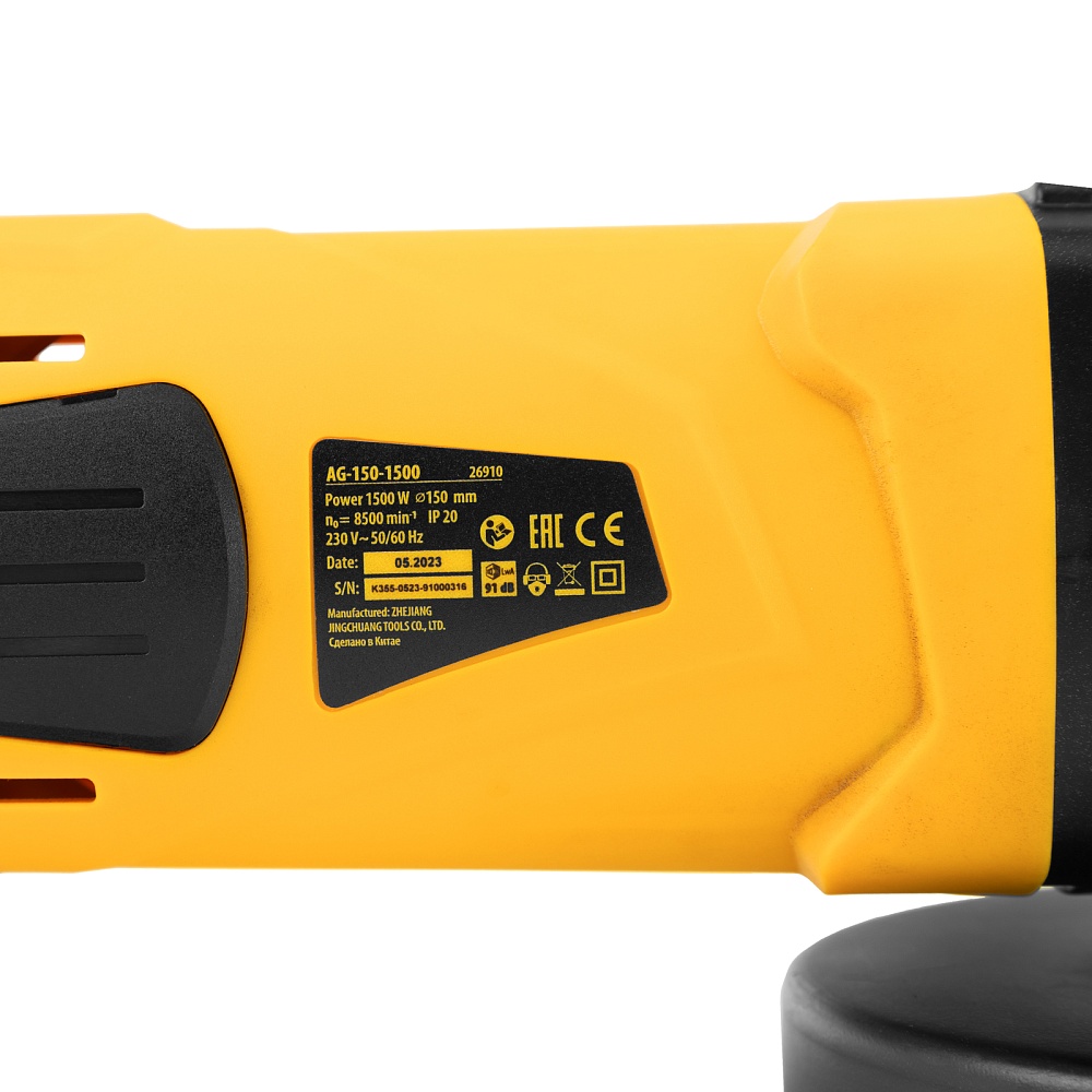 <p>Угловая шлифовальная машина Denzel AG150-1500 26910 мощностью 1500 Вт совместима с насадками максимальным диаметром 150 мм, поддерживает частоту вращения шпинделя 8500 об/мин, благодаря чему эффективно справляется с обработкой и зачисткой поверхностей, а также резкой, шлифовкой металла толщиной до 50 мм и камня. Пригодится дома, в гараже и на даче.</p><h2>Преимущества</h2><ul><li>Высокий ресурс — усиленная пылезащита обеспечивает 450 часов работы даже при резке камня или бетона.</li><li>Безопасность — кнопка блокировки предотвращает случайный запуск УШМ.</li><li>Надежность — усовершенствованная конструкция щеточного узла обеспечивает стабильную работу двигателя.</li><li>Быстрая подготовка к работе — для установки защитного кожуха на УШМ не требуются дополнительные инструменты.</li><li>Удобное обслуживание — в комплект входят специальный ключ и запасные угольные щетки.</li><li>Мобильность — кабель длиной 3 м позволяет увеличить рабочую зону.</li><li>Эргономичность — боковую рукоятку можно установить в 1 из 3 положений: слева, справа или сверху.</li><li>Комфортная работа — прорезиненная рукоятка удобно лежит в руке и не выскальзывает из ладони.</li><li>Гарантия 3 года — качество шлифовальной машинки подтверждено производителем.</li></ul>