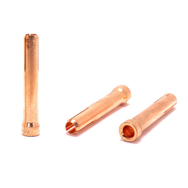 Цанга выполнена из меди и вставляется в держатель цанги. Служит для плотной фиксации вольфрамового электрода в горелке TIG. Диаметр цанги должен совпадать с диаметром вольфрамового электрода, а также с диаметром держателя цанги. Совместима с горелками TIG серии TP 17/18/26.