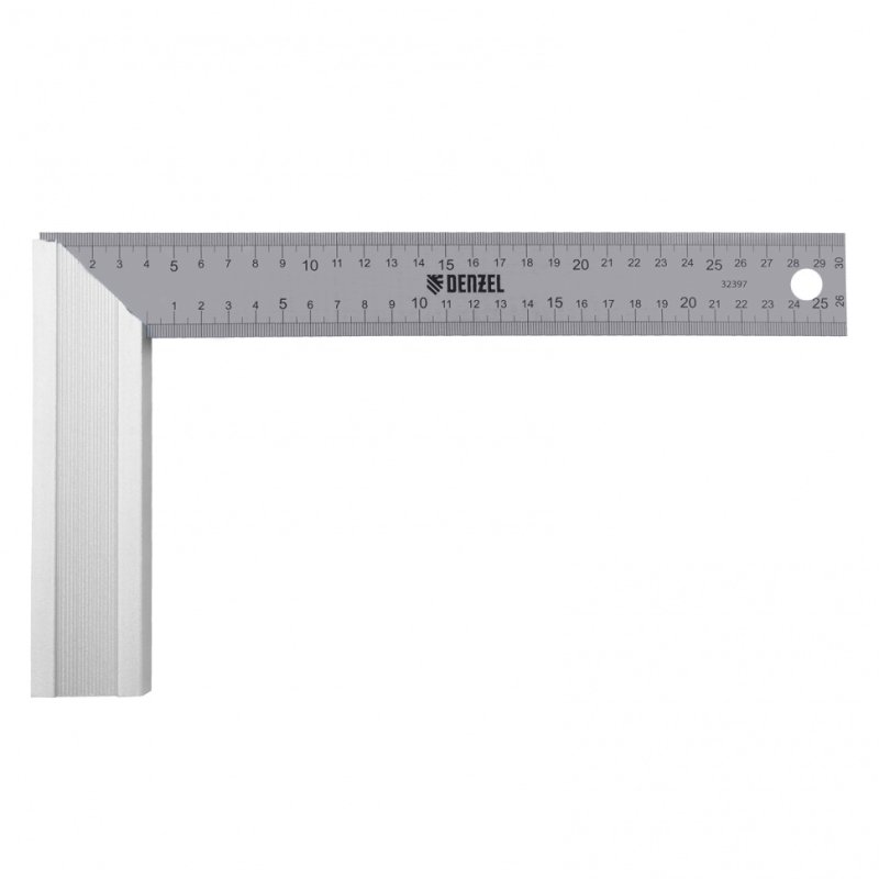 <p>Стальной угольник Denzel 32397 длиной 300 мм, с градуировкой, алюминиевым основанием и полотном из нержавеющей стали, используется для построения и контроля углов. Будет полезен для выполнения столярных и строительных работ.</p><h2>Преимущества</h2><ul><li>Прочность и долговечность — основание изготовлено из анодированного алюминия, рабочее полотно — из нержавеющей стали.</li><li>Надежная конструкция — линейка соединена с основанием при помощи заклепок.</li><li>Удобный хват — благодаря ребристой поверхности основание не выскальзывает из ладони.</li><li>Комфортная эксплуатация — двухсторонняя измерительная шкала облегчает работу.</li><li>Удобное хранение — благодаря специальному отверстию инструмент можно подвешивать на крючок или гвоздь.</li></ul>