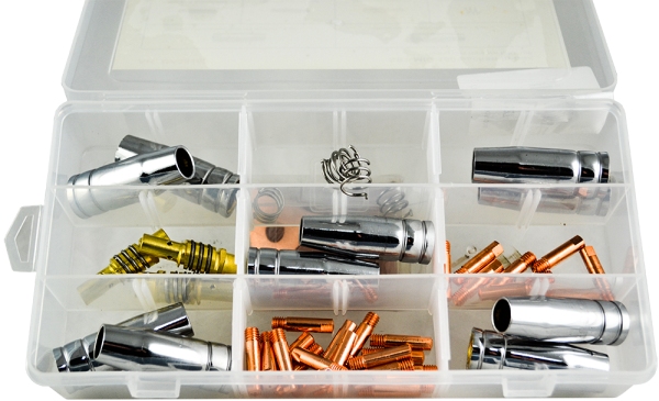 Универсальный набор запасных частей для горелок, входящих в комплект полуавтоматических сварочных аппаратов. Поставляется в пластиковом боксе. - Токовый наконечник M6 для стальной проволоки 0.8мм, 20 шт; - Токовый наконечник М6 для алюминиевой проволоки 0.8мм, 10 шт.; - Газовое сопло для горелки MIG-150, диам. 12 мм, 8 шт.; - Газовое сопло для горелки MIG-150, диам. 9.5 мм, 2 шт.; - Держатель токового наконечника для горелки MIG-150, 3 шт.; - Пружина газового сопла для горелки MIG-150, 5 шт. Вес брутто: 1.2 кг Место 1 (ДхШхВ): 135х85х50 мм
