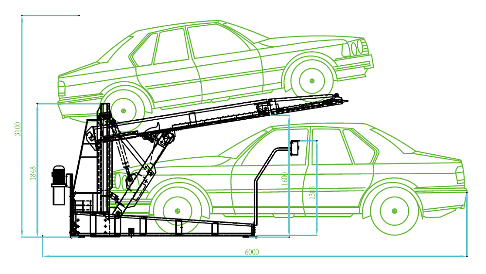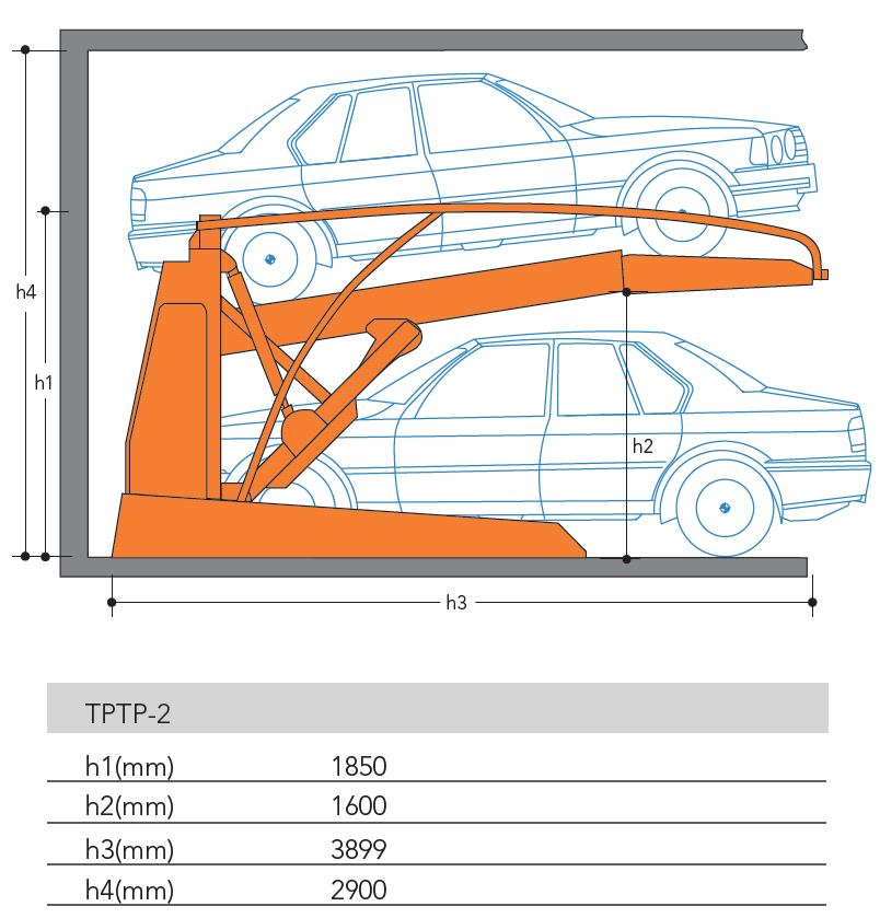 Идеально подходит для парковки автомобилей в помещениях при минимальной высоте потолка 2900мм. Регулируемый угол наклона платформы и максимальная высота подъема позволяют парковать различные модели седанов с грузоподъемностью до 2000кг/ машиноместо.