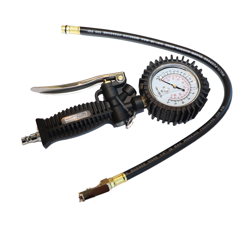 KRWTG-A3 KraftWell Пистолет для подкачки шин. В цветной коробке. Аналоговый жидкостный манометр. Пластиковая рукоятка, металлический курок. Давление до 16 бар.