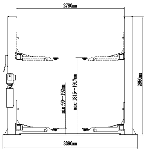 ПГН2–4.0 (A) Подъёмник 2‑стоечный с нижней синхронизацией, 380В Грузоподъемность: 4 тонны Электропитание: 380 В Вес подъемника: 623 кг Расстояние между стойками: 2800 мм