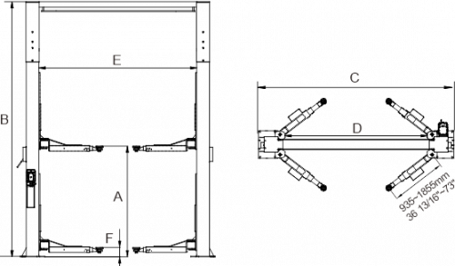 Электрогидравлический двухстоечный подъемник с нижней связью для легковых автомобилей, внедорожников и легкого коммерческого транспорта общей массой до 5т Классическая симметричная конструкция с удлиненными трехсоставными подхватами прекрасно подходит для работы на длиннобазных автомобилях Усиленная конструкция колонн Подходит для СТО с невысокими потолками