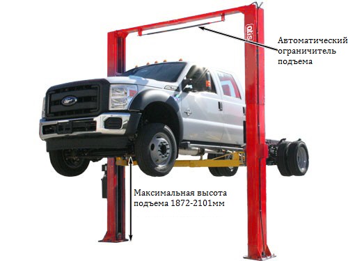 Двухстоечный электрогидравлический подъемник для легковых автомобилей, микроавтобусов, «джипов» и легких грузовиков типа «Газель» общей массой до 5 т. Верхняя синхронизация. Расположение стоек – симметричное. Электроуправление подъема и опускания.