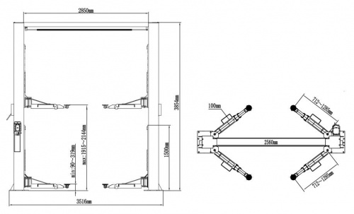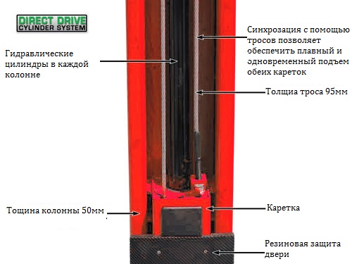 Двухстоечные электрогидравлические подъемники с верхней синхронизацией, симметричное или ассиметричное (по выбору пользователя) расположение стоек.