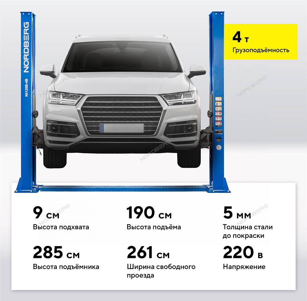 Подъемник двухстоечный 4 т, 380 В, синий NORDBERG N4120B-4B_3+2_380 купить в Перми цена ✅ - Все для СТО
