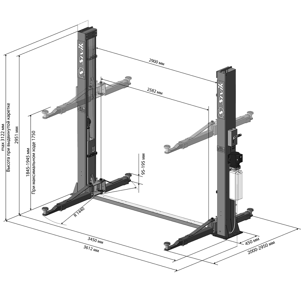 Механическое управление стопорами на одной колонне Комплект телескопических удлинителей Позволяет обслуживать как короткобазные автомобили, так и длиннобазные.
