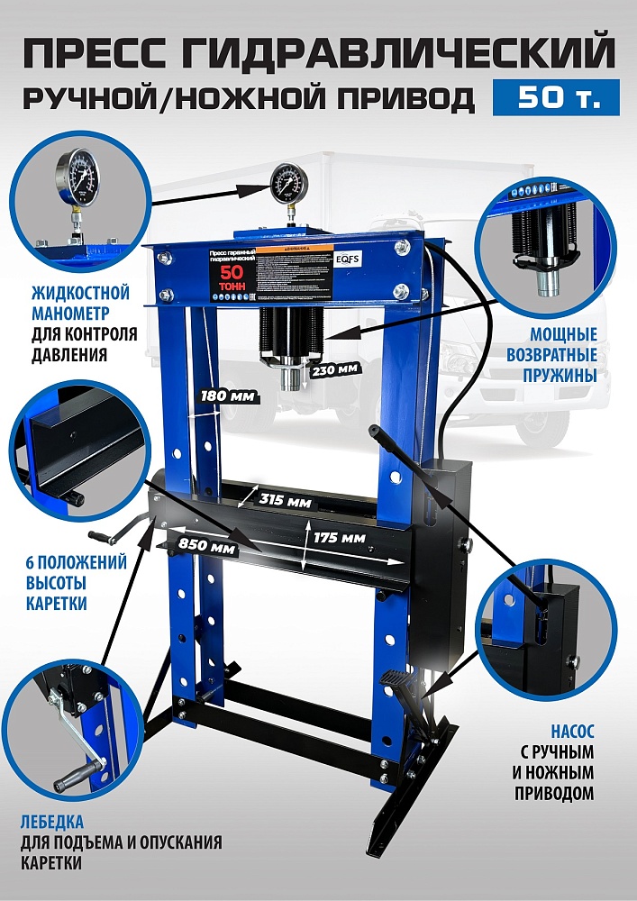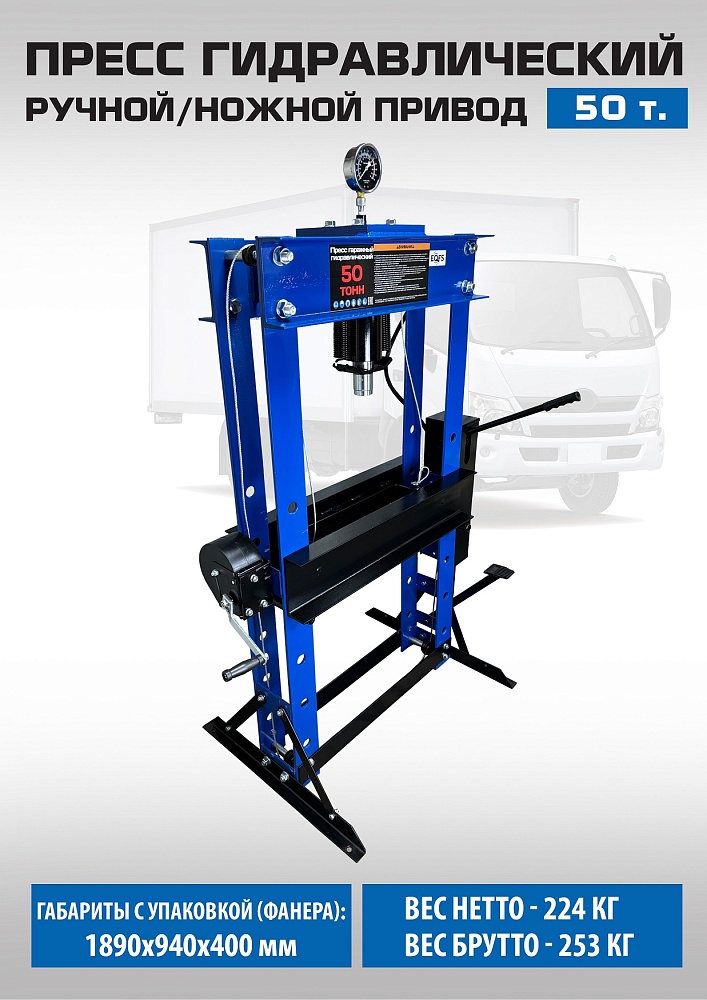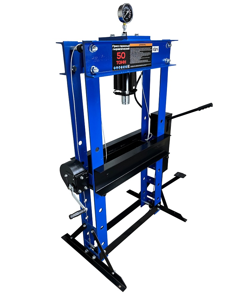 Пресс гидравлический 50 тонн ножной / ручной для автосервиса, усилие 50 тонн. «Свободные руки». ножной / ручной. Пуансон 0-230 мм. Рабочее окно 650х815 мм. Доставка по РФ и ТС. Поршень приводится в действие нажатием на ручку или педаль. Рекомендуется для выпрессовки подшипников, деталей машин, втулок и т.п. в автосервисе, гараже и СТО. Цвет синий.