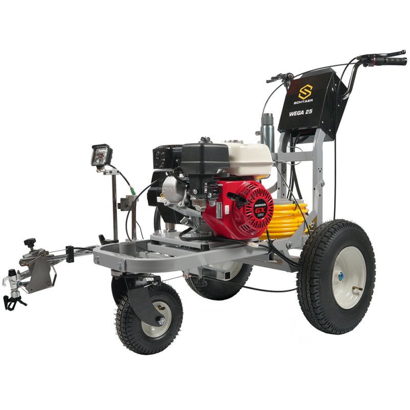Разметочная машина WEGA 25 от компании SCHTAER — это высокопроизводительный аппарат, предназначенный для точного нанесения разметки на различных поверхностях, включая парковки, бордюры и спортивные площадки. Машина оснащена поршневым насосом, который обеспечивает стабильное давление и равномерное распределение краски.