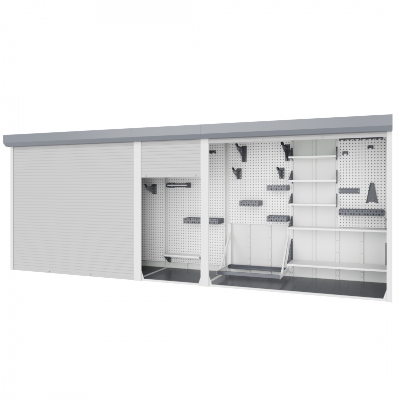 Модульная система хранения с тремя независимыми роллетными блоками. Сборная конструкция, оцинкованный металл, порошковая окраска, антикоррозийная обработка, множество вариантов наполнения.