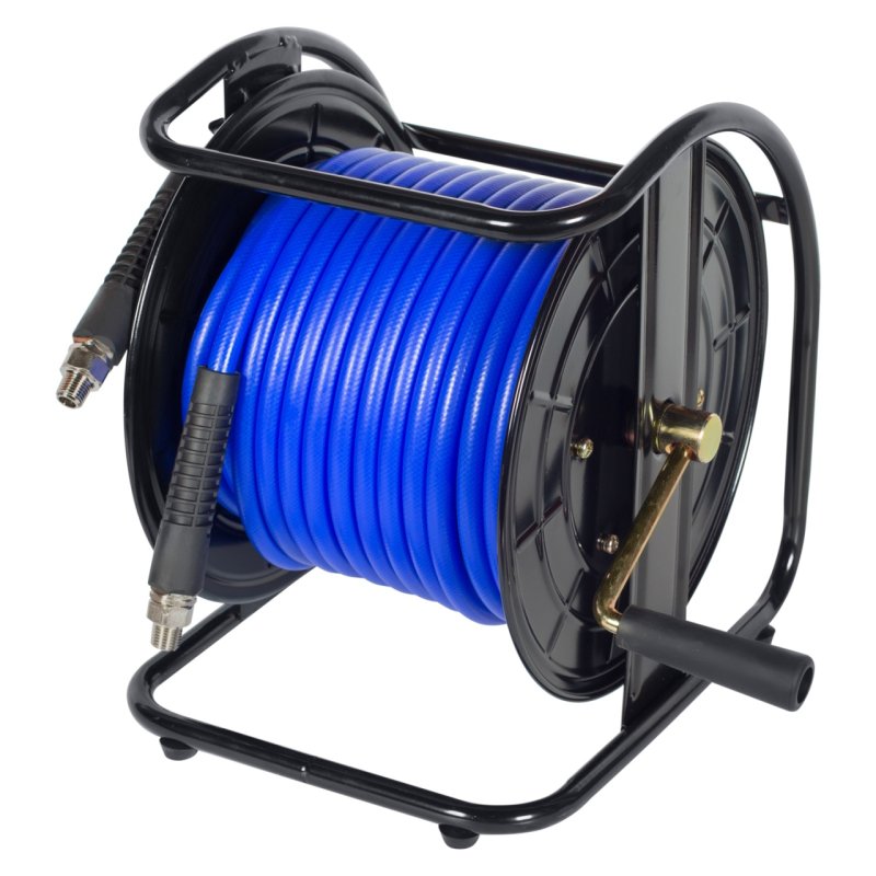 Шланг размещён на катушке, расположенной на специальной раме. Конструкция позволяет разместить шланг на рабочем месте так, как вам удобно, а по окончании работы свернуть шланг и перенести раму с катушкой на место хранения.