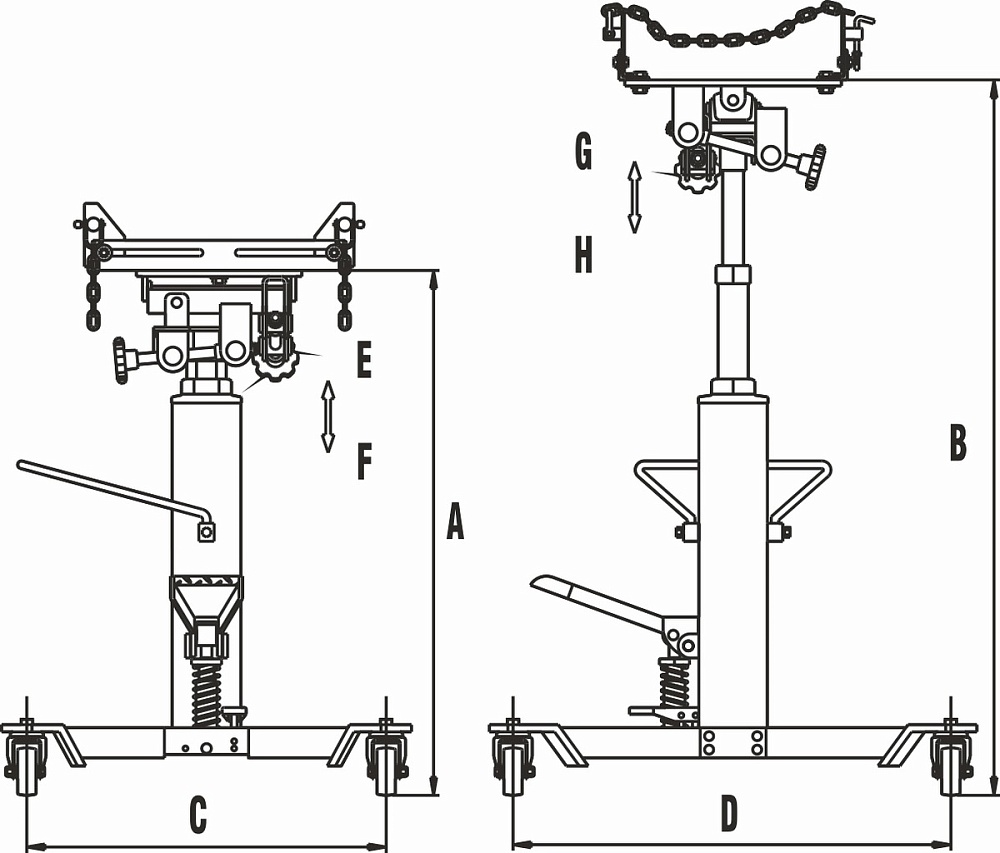 Подъем осуществляется при помощи гидравлического насоса, который приводится в действие педалью, что позволяет оператору полностью контролировать процесс монтажа/демонтажа элементов трансмиссии.