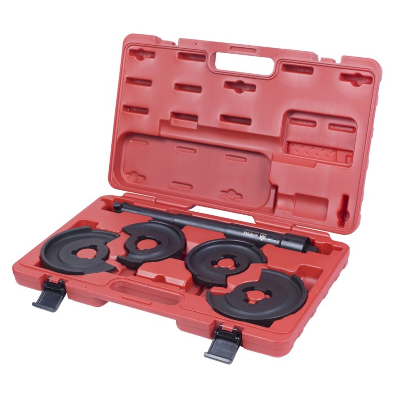 Стяжка амортизаторных пружин, центральная, кованая, дисковые держатели, кейс, 5 предметов МАСТАК 100-01005C. Применяется для снятия и установки пружин без амортизатора внутри. Стяжка производится сжатием силового цилиндра с дисковыми держателями соответствующего диаметра, расположенными по торцам пружины, через центр пружины подвески.