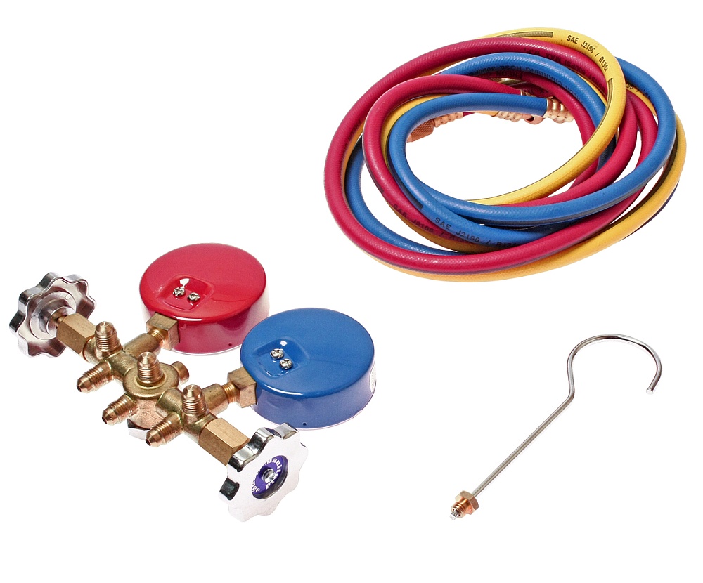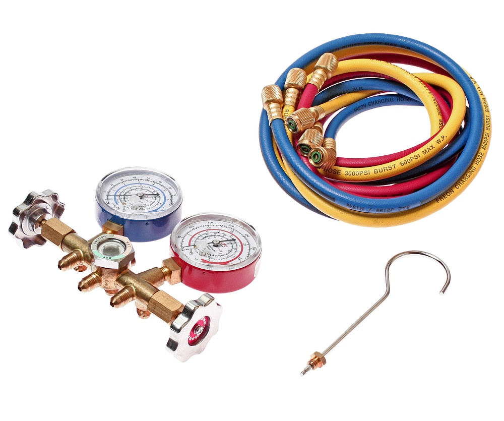 Основу оборудования составляет манометрический коллектор: блок из двух манометров (для измерения давления в каждом из контуров кондиционера) и штуцеров с вентилями.