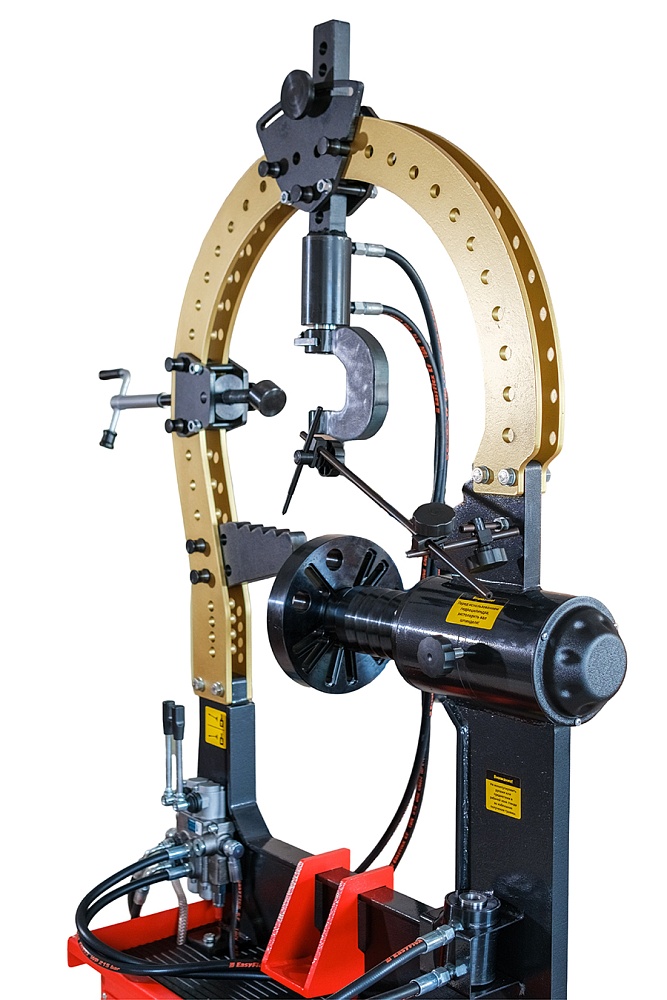 Обновленный стенд получил специальную конструкцию – мост с навесным оборудованием, устанавливаемый на место классических упоров. При этом на мост устанавливаются свои, специальные упоры, полностью замещающие старые и расширяющие возможности ремонта колесных дисков. Также на мост установлен винтовой упор, необходимый для правки сложных повреждений и повреждений типа «восьмерка», и специальный двухсторонний гидроцилиндр с захватом. Конструкция гидроцилиндра позволяет фиксировать его в любом положении и производить правку диска одной рукой, без удержания гидроцилиндра на весу.