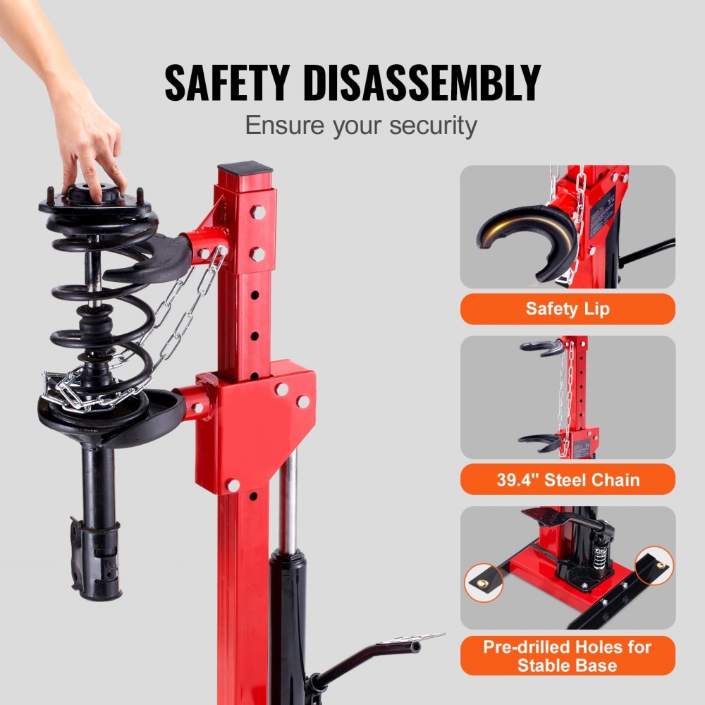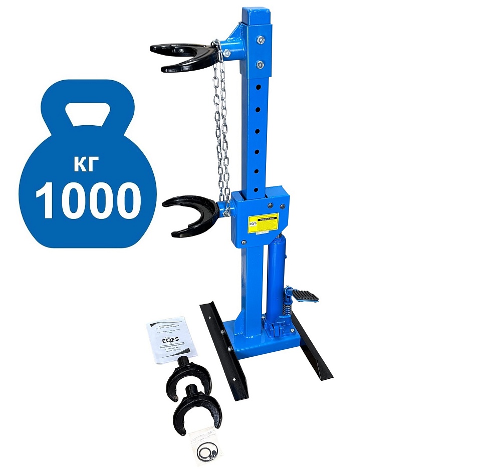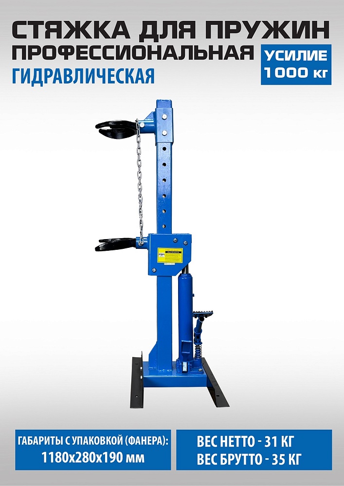 Профессиональная. Напольная с ножным приводом. Облегчает монтаж / демонтаж особо прочных пружин со стойки. Для работы со стойками легковых автомобилей, джипов, микроавтобусов и коммерческого автотранспорта. Конструкция изделия сварная с использованием легированной стали. Гидравлическая с усилием 1000 кг. Ход поршня 325 мм. Диаметр пружины 101 - 180 мм. Рабочая длина min-max 195-520 мм.