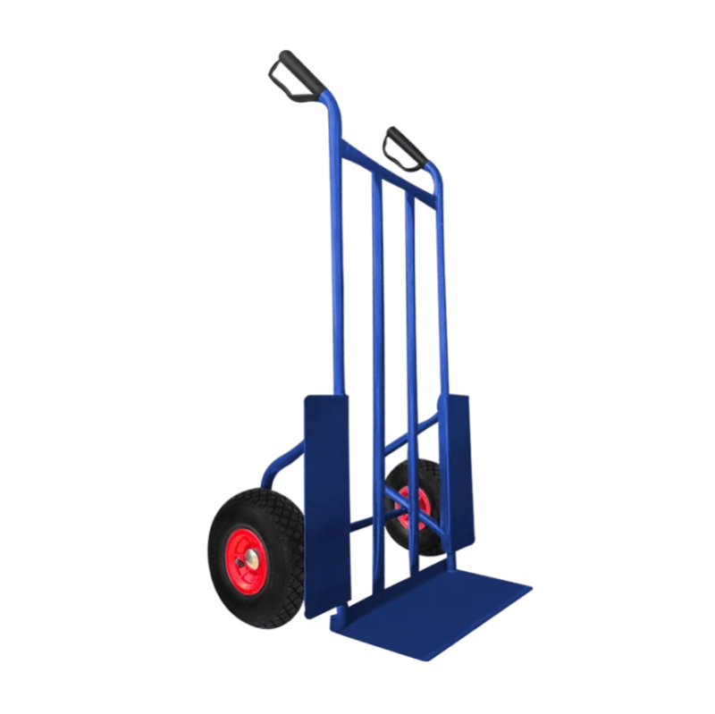 Пневматические колеса диаметром 250 мм способствуют легкому перемещению даже по неровным поверхностям. Для удобства управления и надежности хвата рук ручки тележки прорезинены и имеют дополнительную защиту от травм. Перевозимый груз защищен от колес дополнительными пластинами. Платформа тележки изготовлена из толстой листовой стали и имеет размер 200x350 мм. Для удобства погрузки на задней стороне рамы расположены дополнительные упоры. Металлические элементы ручной тележки защищены от влаги, коррозии и солнечных лучей износостойкой краской.