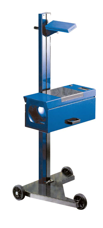 Устройство для периодической калибрации приборов для регулировки света фар. Металлическая коробка содержит эталон фары, переключатель для ближнего/дальнего света, экран для наблюдения вольт, ножки для регулировки, пузырьковый уровень, питательный блок 12В с интегрированным кабелем связи.A